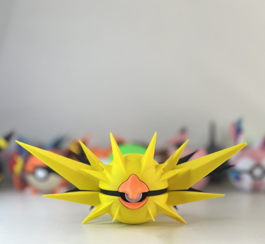 • Diseño de Relieve Afilado: Los patrones geométricos en su superficie evocan las plumas puntiagudas de Zapdos, dándole un aspecto dinámico y agresivo que resalta sobre otras esferas.